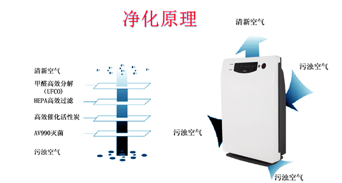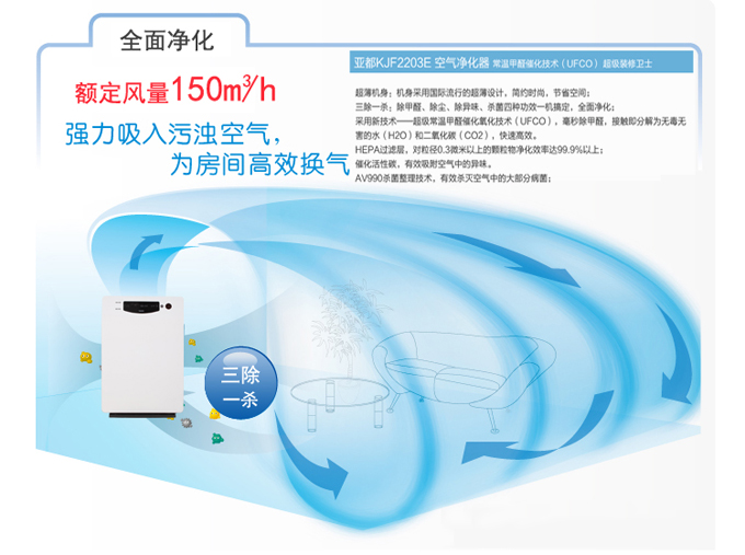 三除一杀;除甲醛、除尘、除异味、杀菌四中功效一机搞定,全面净化。